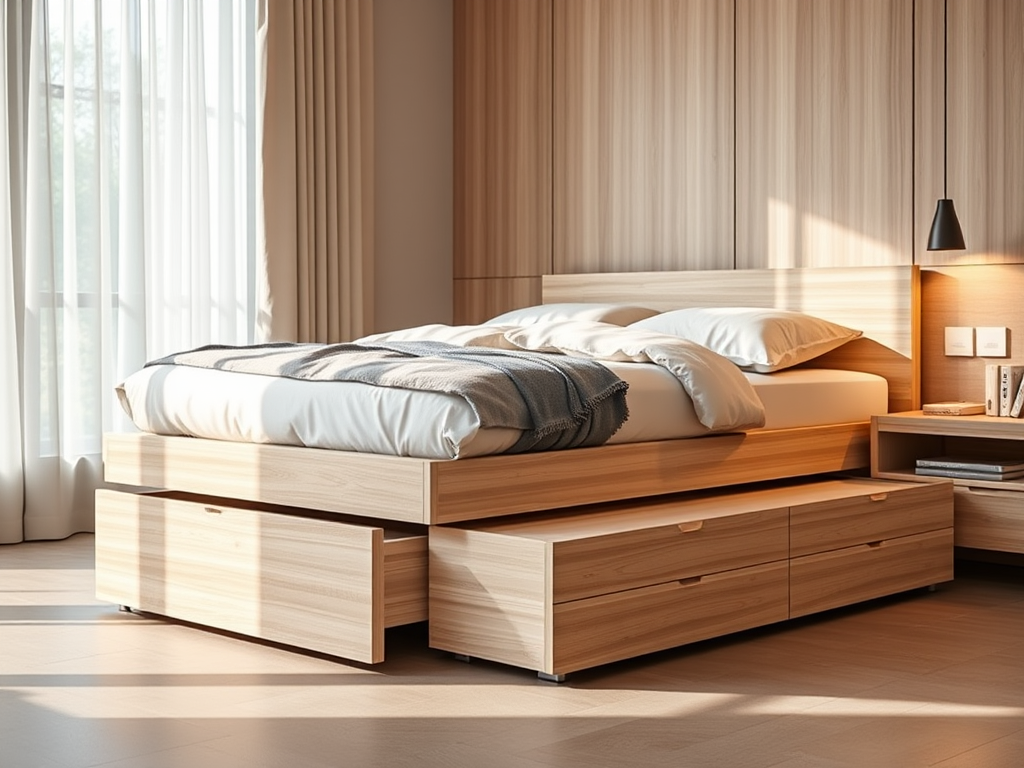 Beds with drawers or space under the mattress help keep everything tidy without extra dressers and cabinets. If you don’t have such a bed, get practical boxes that slide under the bed—perfect for linens, pillows, or seasonal clothes.