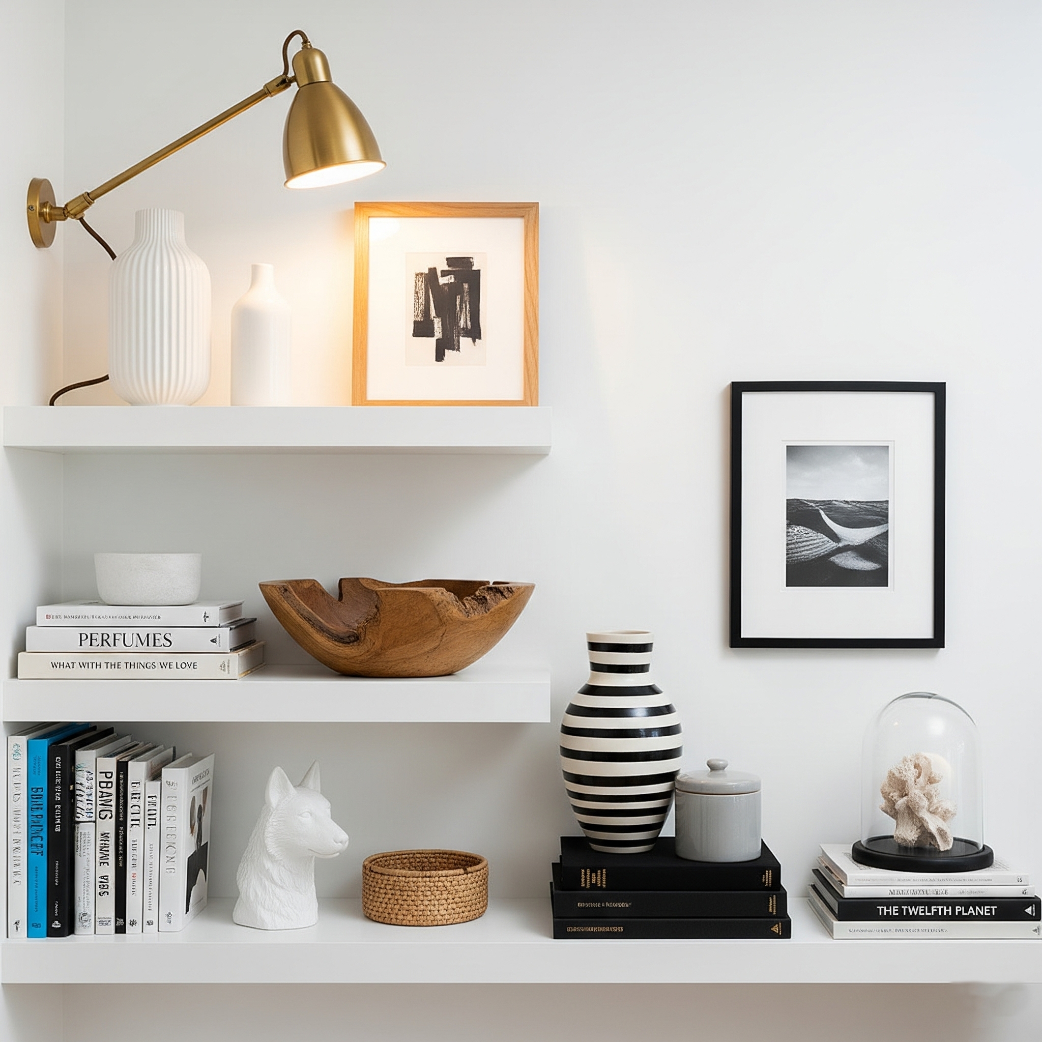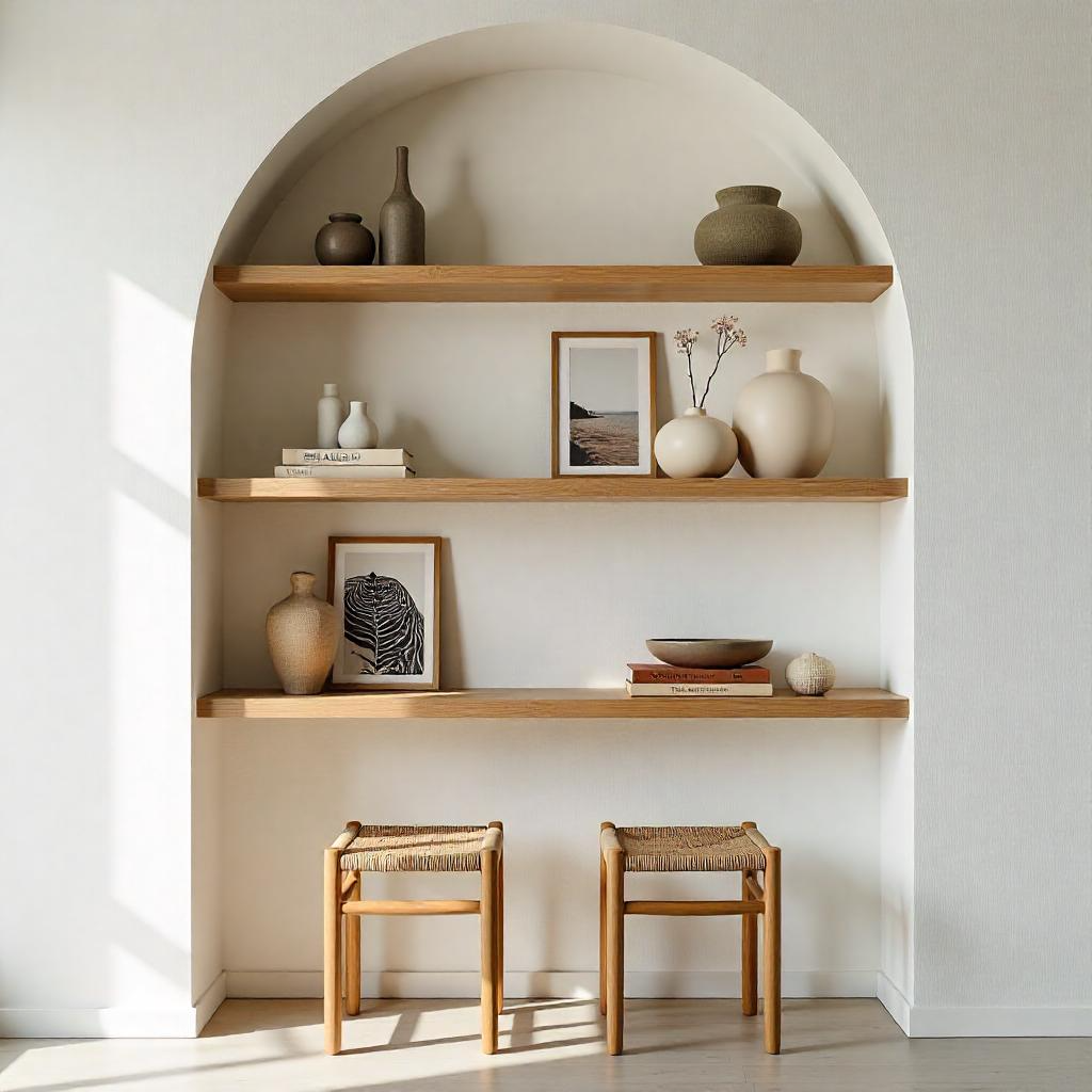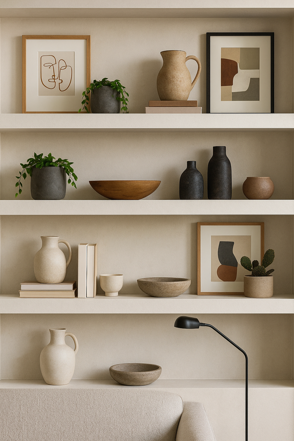 Think of your shelves not as storage, but as small vignettes — curated moments that reflect your style.