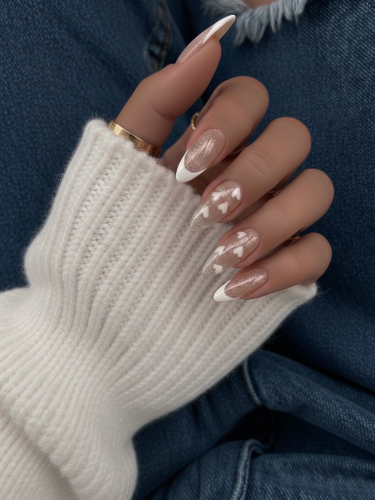 This design pairs a classic white tip with a soft pearlescent shimmer. Tiny hearts on a glittery base create a beautiful balance between playfulness and sophistication—an ideal match for cozy February knits and a feminine aesthetic.