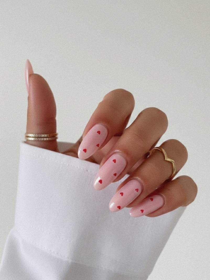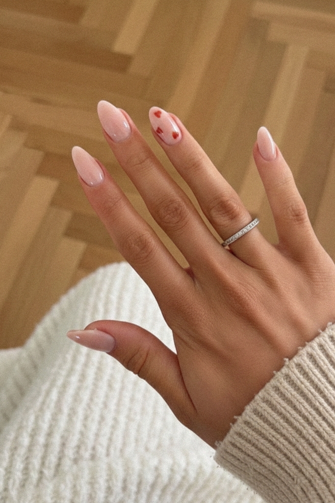 For the ultimate “clean” look, try tiny red hearts on a semi-sheer pink base. This manicure is incredibly neat and ideal for both everyday wear and a special Valentine’s date where you want your details to speak for themselves.