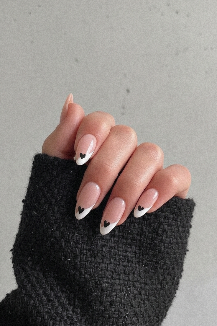 A sophisticated alternative to traditional styles. Pairing timeless white tips with delicate black hearts creates a minimalist look that is both striking and mysterious. It provides a touch of edge through simple, clean details.